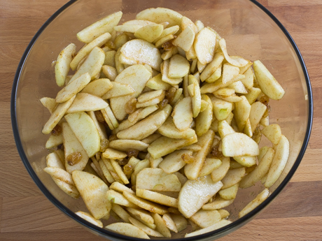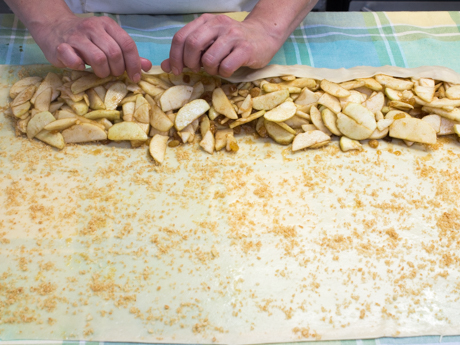 Déposer la moitié de la chapelure pour former une bande de six pouces (15 centimètres) parallèle au côté le plus près de vous, en prenant soin de les deux premiers pouces (5 centimètres) libres. Déposer la garniture aux pommes sur la chapelure.