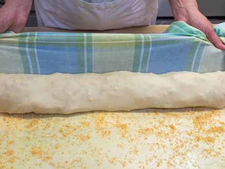 Rabattre la bordure de la pâte sur la garniture et rouler en utilisant le linge pour soulever la pâte. Dissimuler le bout de la pâte sous le strudel roulé.