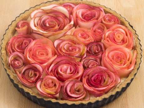 Verser la crème pâtissière et étendre uniformément. Déposer délicatement les roses par-dessus pour recouvrir complètement la tarte. Cuire au four pendant 15 minutes.