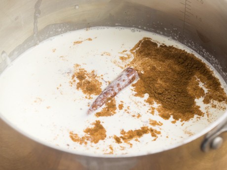 Combiner le lait, la crème, la cannelle moulue, le sel, les bâtons de cannelle, les graines de vanille et la gousse dans une casserole moyenne. Faire frémir, couvrir et laisser épaissir pendant 20 minutes hors du feu.