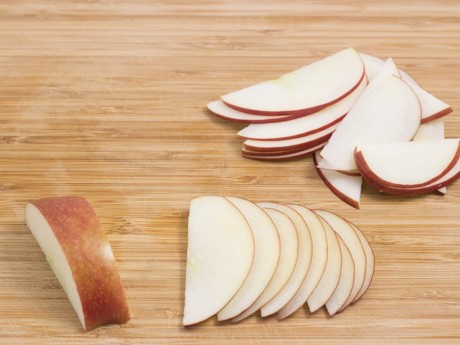 Couper les pommes en laissant le cœur au centre pour obtenir quatre morceaux, puis couper chaque morceaux en fines tranches d’envrion 1/16 po (0.15 cm). Déposer dans le bol d’eau citronnée.