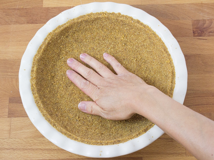 Saupoudrer la tarte des miettes de biscuits graham. Découper à l’aide d’un couteau de chef trempé dans l’eau chaude puis essuyé. Servir immédiatement.